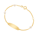Faites graver ce bracelet d'identité pour enfant en or jaune 18 carats/750 millièmes pour en faire un cadeau personnalisé à offrir à une fille ou à un garçon de votre entourage ! Ce ravissant bijou mixte se compose d'une chaîne aux maillons serrés portant une plaque ovale et 3 magnifiques perles blanches.