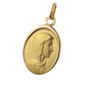 Sur cette jolie médaille ovale en or jaune 18 carats/750 millièmes se détache le visage de la Vierge, de profil. Minutieusement gravé, ce bijou pour femme et homme à l'aspect satiné présente un contour en relief, épais dans sa partie haute et qui s'affine progressivement jusqu'à disparaître en bas du pendentif.