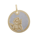 Un joli contraste habille ce pendentif en acier et or jaune 18 carats/750 millièmes. Un ange pensif et souriant, un ciel étoilé, tout est réuni pour offrir aux futurs petits baptisés un bijou charmant et doux, discret et confortable à porter.